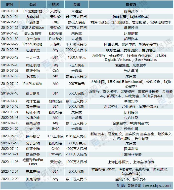 寵物食品賽道作為國內較為新興的行業,整個市場還處于培育期和初步競爭階段。2020年中國寵物食品行業融資規模雖較2019年有所下降,但單筆投資金額有所擴大,投資資源逐漸向優質企業集中,其中帥克寵物、寵幸寵物、毛星球FurFurLand等企業均獲得不同金額的投資。