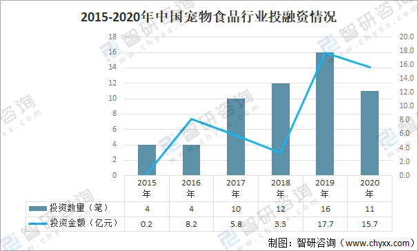 一個賽道崛起的背后,往往少不了資本的助推。近年來,寵物食品賽道的吸金能力有所提升。受疫情影響,2020年中國寵物食品行業投資熱度較2019年稍有下降,投資數量為11筆,較2019年減少了5筆;投資規模為15.7億元,同比下降11%。