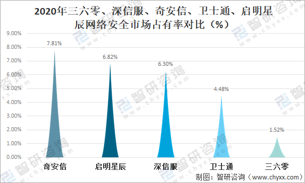 2020年三六零、深信服、奇安信、衛士通、啟明星辰網絡安全市場占有率對比