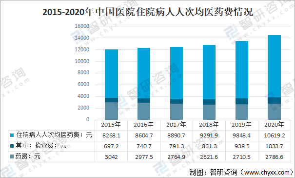 2020年中國二級醫(yī)院住院病人人次均醫(yī)藥費(fèi)6760.5元,較2019年增長528.1元,其中:藥費(fèi)1765.3元,占住院醫(yī)藥費(fèi)的26.1%;檢查費(fèi)700.1元,占住院醫(yī)藥費(fèi)的10.4%。