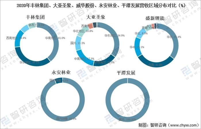 從營收區域分布來看,豐林集團營業收入主要來源于華南地區,2020年豐林集團華南地區營業收入為7.13億元,占營業總收入的41.0%。大亞圣象營業收入主要來源于華東地區,2020年大亞圣象華東地區營業收入為25.38億元,占營業總收入的34.9%。盛新鋰能營業收入主要來源于華東地區,2020年盛新鋰能華東地區營業收入為6.349億元,占營業總收入的35.4%。永安林業營業收入主要來源于國內,2020年永安林業國內銷售收入為5.453億元,占營業總收入的93.9%。平潭發展營業收入主要來源于國內,2020年平潭發展國內營業收入為12.34億元,,占營業總收入的100%.