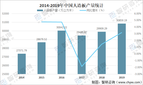 隨著下游建筑裝飾裝修、家具、地板、門窗、以及包裝材料等領域的快速發展,中國人造板行業也高速發展,2019年中國人造板產量達30859.19萬立方米,較2018年增加了949.9萬立方米,同比增長3.18%。