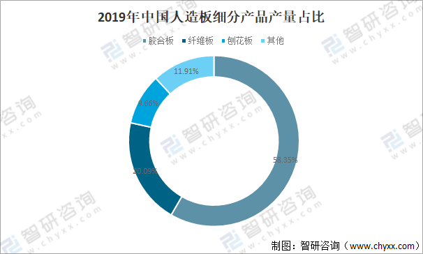 2019年膠合板產量占人造板總產量的58.35%,占比最大;纖維板產量占人造板總產量的20.09%;刨花板產量占人造板總產量的9.66%。