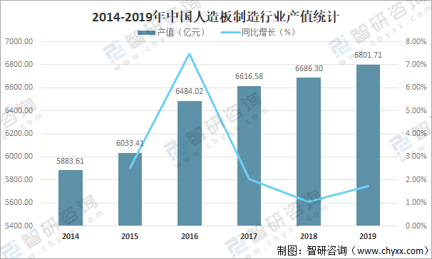 人造板行業的發展優勢是最大限度的利用木材的價值,節約木材資源,緩解由于社會經濟發展帶來的木材短缺問題,對于促進林業經濟的發展,構建經濟與自然和諧發展的經濟起到很重要的作用。人造的制作過程就是利用林業生產剩余以及浪費下來的木質原材料以及一切其他的非木質的材料,通過人為的加工變成人造板來使用,所以說發展人造板行業很重要。在我國經濟快速發展的帶頭下,尤其是建筑業,房地產和家具行業的發展,為人造板的發展創造了機遇,提供便利條件。2019年中國人造板制造行業產值達6801.71億元,較2018年增加了115.4億元,同比增長1.73%。