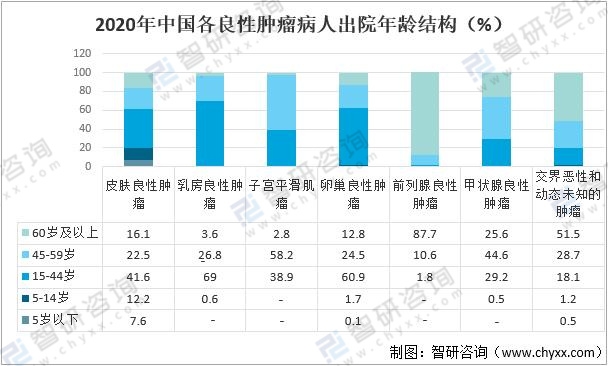 2020年,中國皮膚良性腫瘤出院病人中5歲以下占7.6%;5-14歲占12.2%;15-44歲占41.6%;45-59歲占22.5%;60歲及以上占16.1%;乳房良性腫瘤出院病人中5-14歲占0.6%;15-44歲占69%;45-59歲占26.8%;60歲及以上占3.6%。子宮平滑肌瘤出院病人中15-44歲占38.9%;45-59歲占58.2%;60歲及以上占2.8%。卵巢良性腫瘤出院病人中5歲以下占0.1%;5-14歲占1.7%;15-44歲占60.9%;45-59歲占24.5%;60歲及以上占12.8%。前列腺良性腫瘤出院病人中15-44歲占1.8%;45-59歲占10.6%;60歲及以上占87.7%。甲狀腺良性腫瘤出院病人中5-14歲占0.5%;15-44歲占29.2%;45-59歲占44.6%;60歲及以上占25.6%。交界惡性和動態未知的腫瘤出院病人中5歲以下占0.5%;5-14歲占1.2%;15-44歲占18.1%;45-59歲占28.7%;60歲及以上占51.5%。