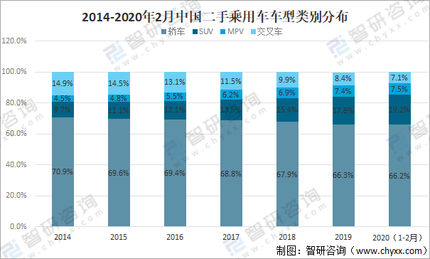 2014-2020年中國二手乘用車細分類別銷量占比(%)