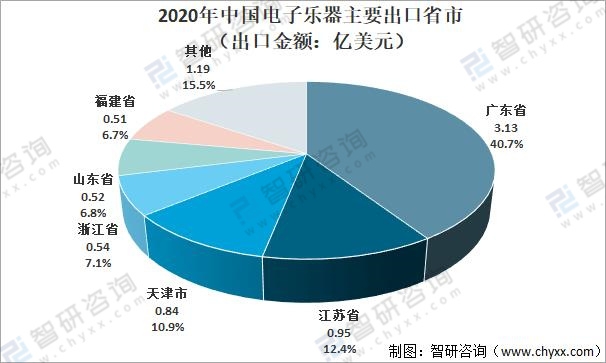 從出口金額來(lái)看,廣東省是中國(guó)最大的電子樂器出口省,2020年出口金額為3.13億美元,占全國(guó)總出口金額的40.7%;江蘇省出口金額為0.95億美元,占比12.4%;天津市、浙江省、山東省、福建省分布占比10.9%、7.1%、6.8%、6.7%。