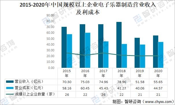 近年來(lái)在互聯(lián)網(wǎng)技術(shù)飛速發(fā)展的推動(dòng)下,電子樂器可接入互聯(lián)網(wǎng)、連接智能終端、PC與云端數(shù)據(jù)庫(kù)的優(yōu)勢(shì)逐步顯現(xiàn),電子樂器發(fā)展前景較好。根據(jù)中國(guó)樂器年鑒數(shù)據(jù):2020年中國(guó)規(guī)模以上電子樂器制造企業(yè)共有21家,實(shí)現(xiàn)營(yíng)業(yè)收入55.65億元,營(yíng)業(yè)成本為44.57億元。