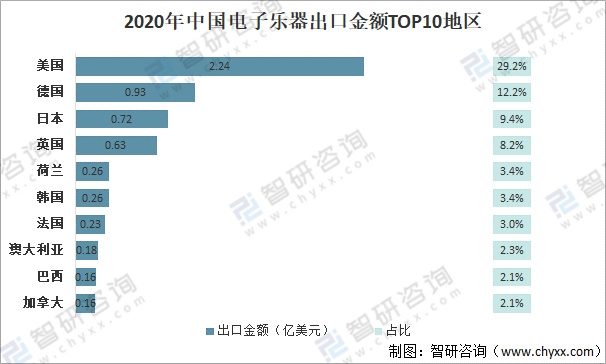 2020年中國(guó)電子樂器出口金額TOP10地區(qū)