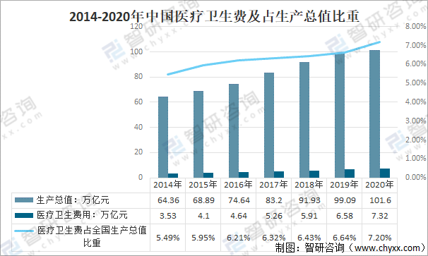 衛(wèi)生總費用是指一個國家或地區(qū)在一定時期內(nèi)全社會用于醫(yī)療衛(wèi)生服務(wù)所消耗的資金總額。是以貨幣作為綜合計量手段,從全社會角度反映衛(wèi)生資金的全部運動過程,分析與評價衛(wèi)生資金的籌集、分配和使用效果。衛(wèi)生總費用,是標志一個國家整體對衛(wèi)生領(lǐng)域的投入高低。作為國際通行指標,衛(wèi)生總費用被認為是了解一個國家衛(wèi)生狀況的有效途徑之一,按照世衛(wèi)組織的要求,發(fā)展中國家衛(wèi)生總費用占GDP總費用不應(yīng)低于5%。2014年以來,中國醫(yī)療衛(wèi)生費用及占全國生產(chǎn)總值比重逐年增長,2020年中國醫(yī)療衛(wèi)生費用7.32萬億元,占全國生產(chǎn)總值的7.20%。