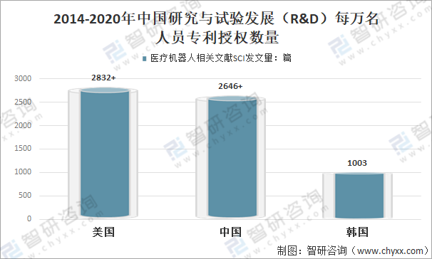 據(jù)公開數(shù)據(jù),美國醫(yī)療機器人的發(fā)文2832篇;中國醫(yī)療機器人的發(fā)文量在SCI逐年遞增,已達到2646篇,僅次于美國;較位于第三韓國的醫(yī)療機器人的發(fā)文1003篇多1643篇。