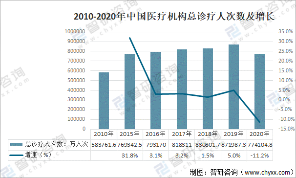 2010-2020年中國醫(yī)療機構(gòu)總診療人次數(shù)及增長