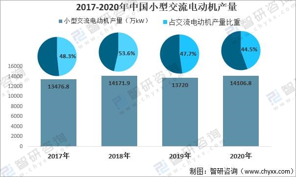 中國小型交流電動機產量占交流電動機產量40%以上,根據中國電器工業協會中小型電機分會對63家企業統計: 2019年中國小型交流電動機產量13720萬KW,2020年產量為14106.8萬KW,占交流電動機總產量的44.5%。
