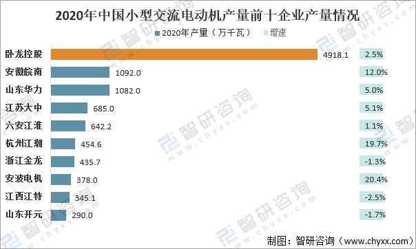 2020年中國小型交流電動機產量前十企業依次為臥龍控股、安徽皖南、山東華力、江蘇大中、六安江淮、杭州江潮、浙江金龍、安波電機、江西江特、山東開元,其中共有7家企業實現產量正增長,增幅最大的為杭州江潮;浙江金龍、江西江特、山東開元三家企業產量稍有下降。