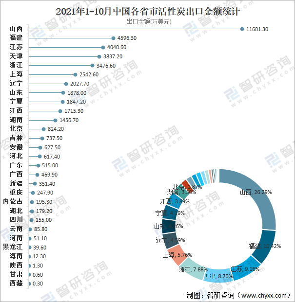 2021年1-10月中國各省市活性炭出口金額統計