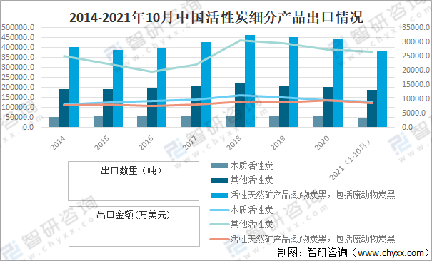 2014-2021年10月中國活性炭細分產品出口情況
