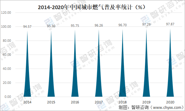 近年來中國城市燃氣普及率逐年攀升,2020年中國城市燃氣普及率達97.87%,較2014年的94.57%增長了3.30%。