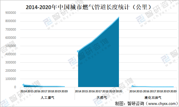 從管道長度來看,2020年中國城市人工煤氣管道長度為9860公里,較2019年減少了1055.41公里;城市天然氣管道長度為850552公里,較2019年增加了82605.80公里;城市液化石油氣管道長度為4010公里,較2019年減少了441.50公里。