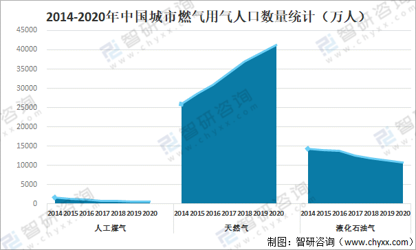 從用氣人口數量來看,2020年中國城市人工煤氣用氣人口數量為548萬人,較2019年減少了127.17萬人;城市天然氣用氣人口數量為41302萬人,較2019年增加了2276.61萬人;城市液化石油氣用氣人口數量為10767萬人,較2019年減少了529.63萬人。