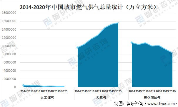 城市燃氣是城市能源結構和城市基礎設施的重要組成部分,它為城市工業、商業和居民生活提供優質氣體燃料,它的發展在城市現代化中起著極其重要的作用。提高城市燃氣化水平,對于提高城市居民的生活質量、改善城市環境、提高能源利用率,具有十分重要的意義,隨著上游輸配管道長度的不斷增加和下游用氣需求量的持續攀升,我國的城市燃氣行業規模不斷擴大,2020年中國城市人工煤氣供氣總量為231447萬立方米,較2019年減少了45394.21萬立方米;城市天然氣供氣總量為15637020萬立方米,較2019年增加了357610.31萬立方米;城市液化石油氣供氣總量為8337109萬立方米,較2019年減少了890070.33萬立方米。