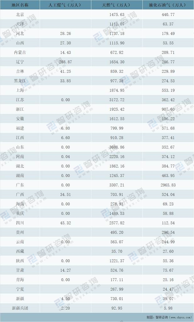 分省市來看,2020年遼寧城市人工煤氣用氣人口數量為288.87萬人,全國排名第一;四川城市人工煤氣用氣人口數量為45.32萬人,全國排名第二;吉林城市人工煤氣用氣人口數量為41.25萬人,全國排名第三。2020年山東城市天然氣用氣人口數量為3608.86萬人,全國排名第一;廣東城市天然氣用氣人口數量為3307.21萬人,全國排名第二;江蘇城市天然氣用氣人口數量為3172.72萬人,全國排名第三。2020年廣東城市液化石油氣用氣人口數量為2965.83萬人,全國排名第一;浙江城市液化石油氣用氣人口數量為907.60萬人,全國排名第二;福建城市液化石油氣用氣人口數量為571.68萬人,全國排名第三。