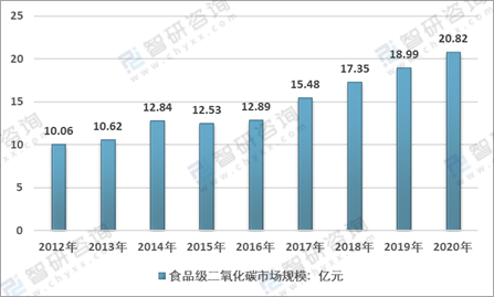 數據顯示:2012年我國食品級二氧化碳市場規模為10.06億元,2020年我國食品級二氧化碳市場規模增長至20.82億元,2012年以來我國二氧化碳市場規模復合增速9.5%。