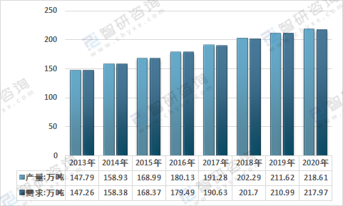 近年來,我國食品級二氧化碳產量逐年增長,2013年我國食品級二氧化碳產量為147.79萬噸,2020年增長至218.61萬噸。下游應用行業的發展使得其對食品級二氧化碳的需求有所增長,2013年我國食品級二氧化碳需求量為147.26萬噸,2020年需求量增長至217.97萬噸。