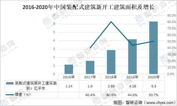 2016-2020年中國裝配式建筑新開工建筑面積及增長