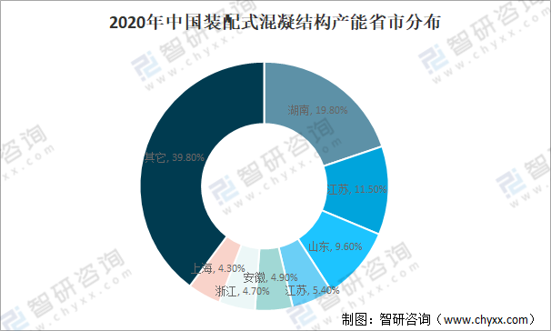 中國裝配式建筑產能主要分布湖南省、江蘇、山東、江蘇、安徽、浙江、上海等地,裝配式混凝結構產能占比分別為19.80%、11.50%、9.60%、5.40%、4.90%、4.70%、4.30%。