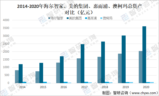 2014-2020年海爾智家、美的集團、惠而浦、澳柯瑪總資產對比(億元)