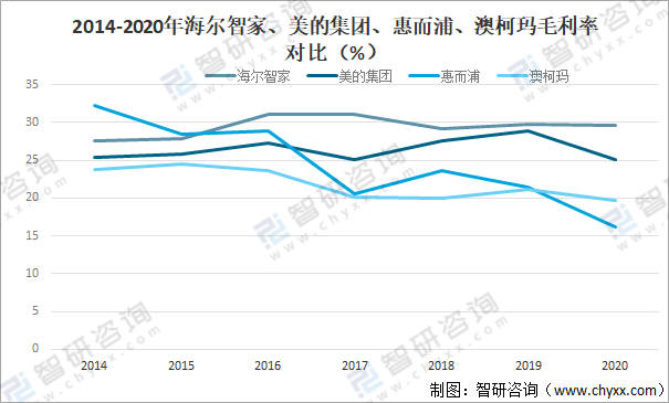 2014-2020年海爾智家、美的集團、惠而浦、澳柯瑪毛利率對比(%)