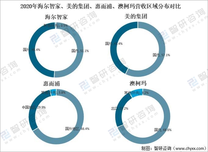 2020年海爾智家、美的集團、惠而浦、澳柯瑪營收區(qū)域分布對比(%)