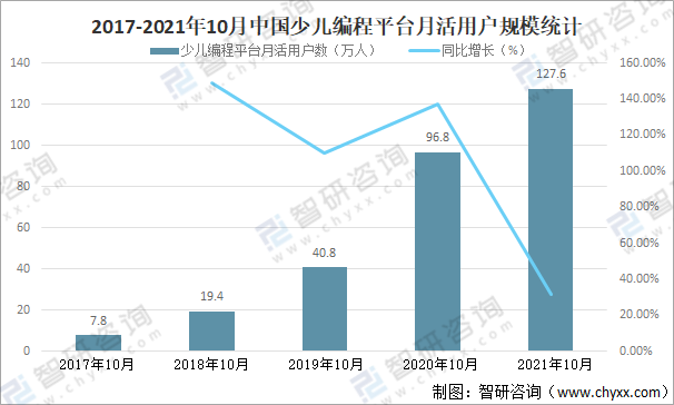隨著中國學習編程的少兒用戶線上渠道學習編程的比例不斷攀升,中國少兒編程平臺月活用戶規模快速增長,2021年10月中國少兒編程平臺月活用戶規模達127.6萬人,較2020年同期增加了30.80萬人,同比增長31.82%。