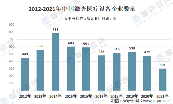 2012-2021年中國激光醫(yī)療設(shè)備企業(yè)數(shù)量