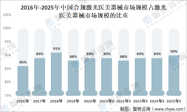 2016年-2025年中國合規(guī)激光醫(yī)美器械市場規(guī)模占激光醫(yī)美器械市場規(guī)模的比重
