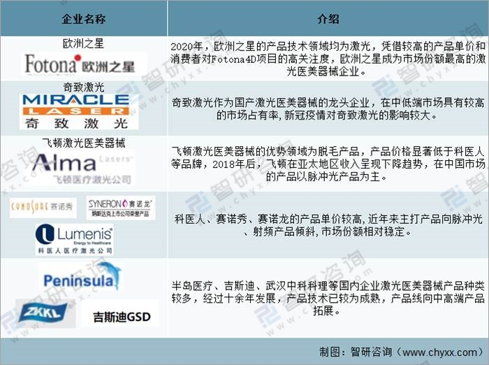 國內(nèi)高端醫(yī)療版光電儀器的廠商很多都來自以色列或與其密切相關(guān)的跨國公司,譬如飛頓、賽諾龍、Endymed、科醫(yī)人等激光設(shè)備商都屬于以色列系。2018-2020年,受益于Fotona4D產(chǎn)品的優(yōu)異市場表現(xiàn),歐洲之星市場占有率提升,科醫(yī)人設(shè)備在終端渠道議價能力高,但激光領(lǐng)域優(yōu)勢不足。