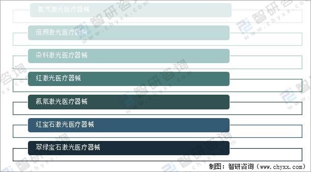 按照國家藥品監(jiān)督局《醫(yī)療器械分類目錄》,根據(jù)醫(yī)美器械的用途可分為有源手術(shù)器械、物理治療器械等6類。激光醫(yī)美器械是屬于物理治療器械。按照激光介質(zhì)的不同,激光醫(yī)美器械可分為氬氣、倍頻、染料、紅、氦氖、紅寶石、翠綠寶石激光醫(yī)療器械。