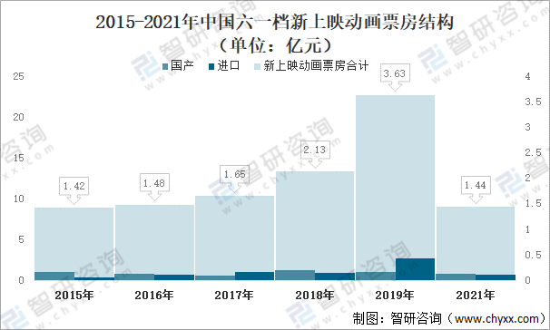 2015-2021年中國六一檔新上映動畫票房結構(單位:億元)