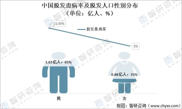 中國脫發人口基數大,其中男性占比較大。據國家衛健委數據統計,中國脫發人群超過2.5億人次,平均每6人中就有1人脫發。男性較為容易患雄激素性脫發,患病率約為21.3%,女性患病率相對較低約為6%。2.5億脫發人群中男性約1.63億人,占5%;女性約0.88億人,占35%。