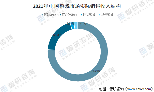 從收入結構來看,移動游戲依然是我國游戲市場的主體,2021年中國移動游戲市場實際銷售收入占全國游戲市場實際銷售總收入的76.06%,占比非常大;客戶端游戲市場實際銷售收入占全國游戲市場實際銷售總收入的19.83%;網頁游戲市場實際銷售收入占全國游戲市場實際銷售總收入的2.03%。