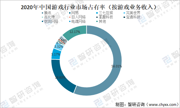 從游戲市場占有率來看,2020年騰訊游戲業務收入占全國游戲市場實際銷售收入的56.01%,占中國市場半壁江山;網易游戲業務收入占全國游戲市場實際銷售收入的19.60%;三七互娛游戲業務收入占全國游戲市場實際銷售收入的5.17%;完美世界游戲業務收入占全國游戲市場實際銷售收入的3.32%;吉比特游戲業務收入占全國游戲市場實際銷售收入的0.94%;巨人網絡游戲業務收入占全國游戲市場實際銷售收入的0.79%%;掌趣科技游戲業務收入占全國游戲市場實際銷售收入的0.64%;寶通科技游戲業務收入占全國游戲市場實際銷售收入的0.55%;愷英網絡游戲業務收入占全國游戲市場實際銷售收入的0.44%;電魂網絡游戲業務收入占全國游戲市場實際銷售收入的0.37%。