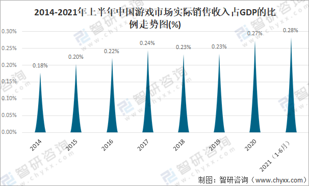2014-2021年上半年中國游戲市場實際銷售收入占GDP的比例走勢圖(%)