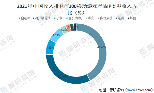 2021年在收入前100移動游戲產品IP類型收入占比中,收入占比最高的是自創IP,占比為42.46%。另有32%、8.33%和8.27%的IP類型收入分別由客戶端游戲、小說和主機/單機游戲改編而來的產品提供。總收入與IP的總數量基本呈正比。