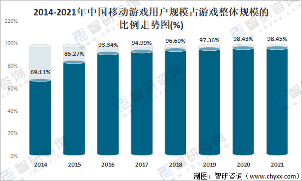 自2016年起中國移動游戲用戶規模占游戲整體規模九成以上的比例,2021年中國移動游戲用戶規模占游戲整體規模的98.45%,較2014年的69.11%增長了29.34%。