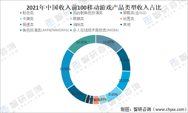 2021年在中國移動游戲收入排名前100的產品中,角色扮演類游戲占比為19.56%;多人在線戰術競技類游戲占比為14.95%;射擊類游戲僅次于多人在線戰術競技類游戲,占比為14.07%,三者占總收入的48.58%,占全部收入的近一半。這三類游戲的用戶基數較大,進而總收入占比較高。