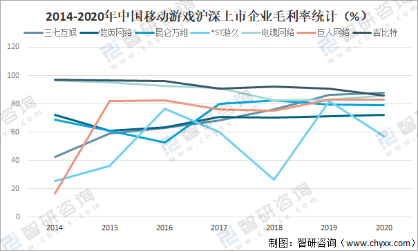 2014-2020年中國移動游戲滬深上市企業毛利率統計(%)