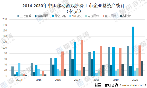2014-2020年中國移動游戲滬深上市企業總資產統計(億元)