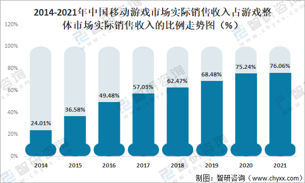 近年來中國移動游戲市場實際銷售收入占游戲整體市場實際銷售收入的比例逐年攀升,目前移動游戲已成為我國游戲市場的主體,2021年中國移動游戲市場實際銷售收入占游戲整體市場實際銷售收入的76.06%,較2014年的24.01%增長了52.05%,