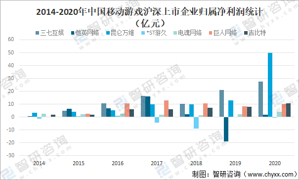 2014-2020年中國移動游戲滬深上市企業歸屬凈利潤統計(億元)