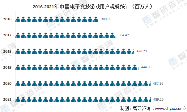 社會的進步、科技的發展以及人們精神文化的需要是電子競技游戲能成為體育項目的重要原因,近年來中國電子競技游戲用戶規模快速增長,2021年中國電子競技游戲用戶規模達489.16百萬人,較2020年增加了1.30百萬人,同比增長0.27%,雖然2021年電子競技游戲用戶規模增速放緩,但在電競入亞和英雄聯盟總決賽奪冠背景下,或帶來明年新一輪增長。